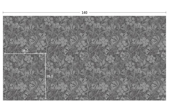 植物の葉のシルエットを繊細なラインで描いた上に花のモチーフを重ねることで、二種類の植物の重なりが奥行きを感じさせるデザインとなっています。