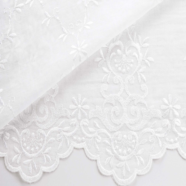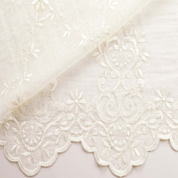 平織りシアーの上にクラシカルな小花のトレリスを刺繍しました。