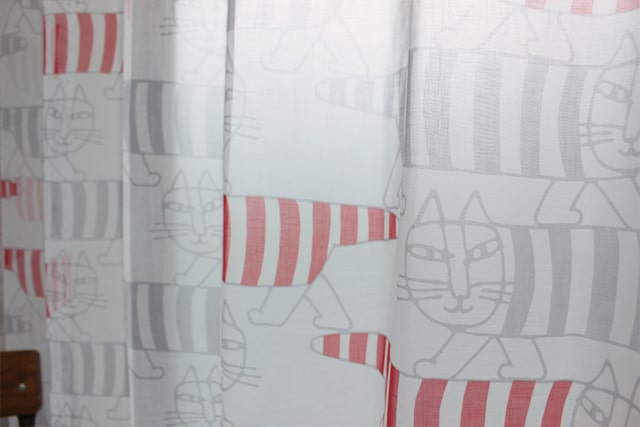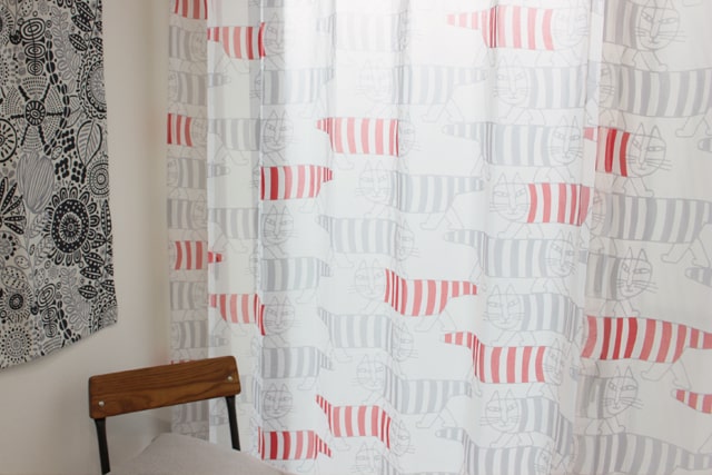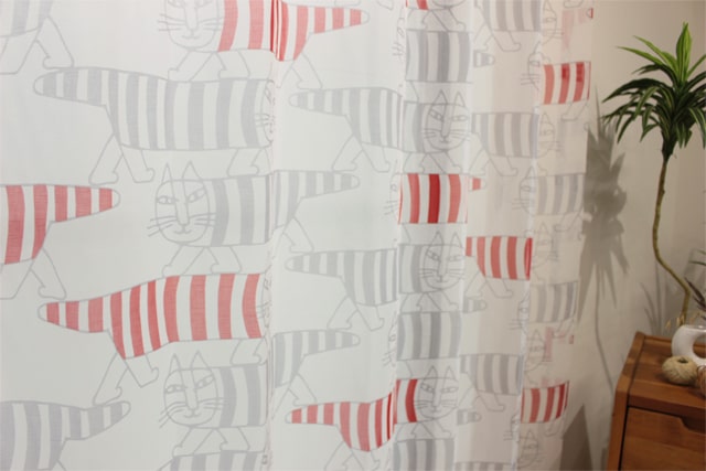 リズミカルに歩く可愛らしいマイキーのモチーフと、赤とグレーのモダンな配色が絶妙なシンプルで大胆な猫柄。