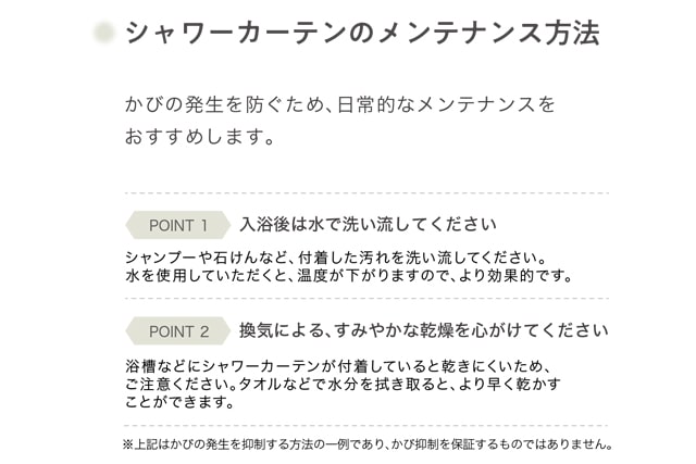 ※石けんなどが付着した場合は、かび発生の原因となりますので水で洗い流してください。